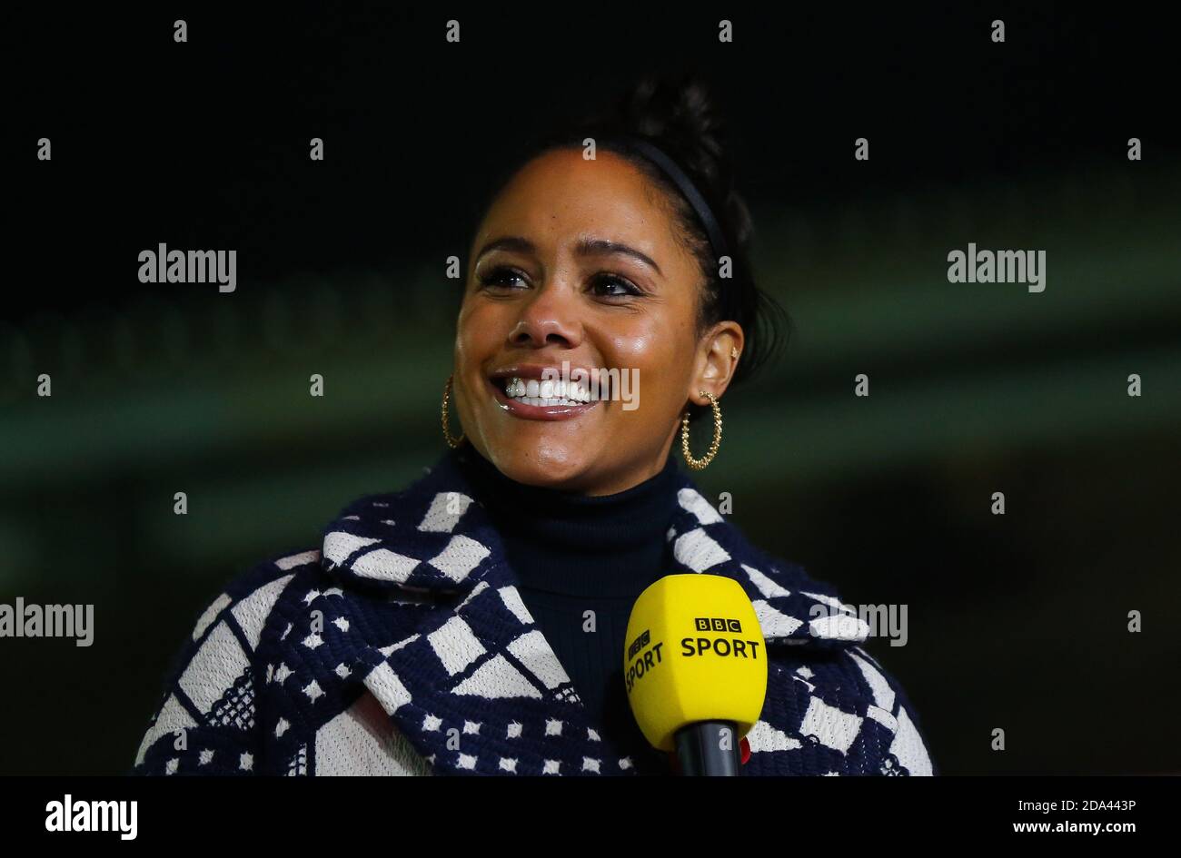 Tv Football Pundit Alex Scott Mbe During Her Commentary Of The Match Between Fc United Of Manchester And Doncaster Rovers During The Fa Cup First Round Match At Broadhurst Park Manchester Stock